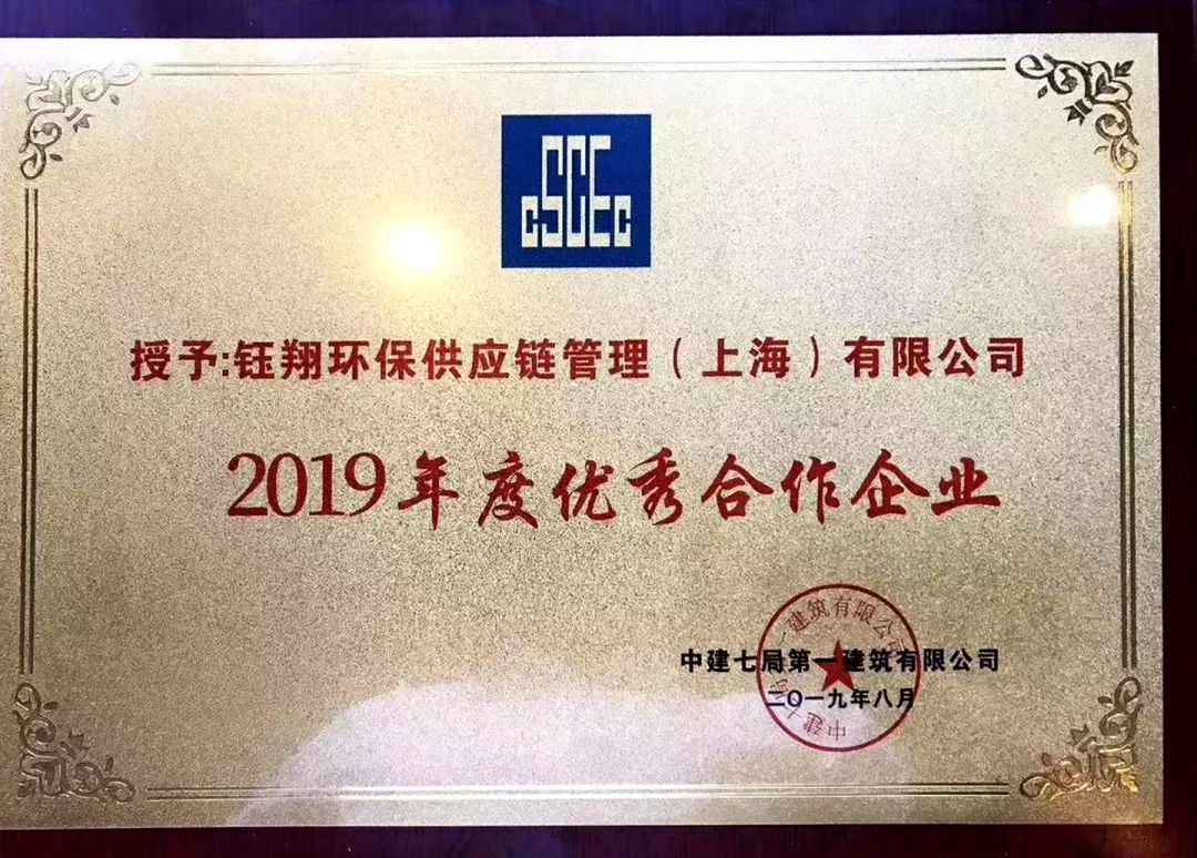 近日,鈺翔環(huán)保供應鏈管理(上海)有限公司被中建七局第一建筑有限公司評為2019年度優(yōu)秀合作企業(yè)。