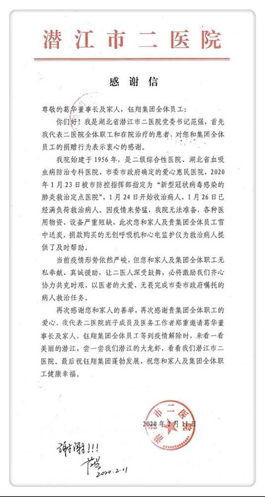 我院始建于1956年,是二級綜合性醫(yī)院,湖北省血吸蟲病防治??漆t(yī)院,市委、市政府確定的愛心惠民醫(yī)院。2020年1月23日被市防控指揮部指定為新型冠狀病毒感染的肺炎救治定點醫(yī)院,1月24日開始收治病人,1月26日已經(jīng)滿負荷救治病人。因疫情來勢兇猛,我院無法準備,各種醫(yī)用物資、設備嚴重短缺,此次您和家人及貴集團全體員工雪中送炭捐款購買的無創(chuàng)呼吸機和心電監(jiān)護儀,為救治病人提供了及時幫助。當前疫情形勢依然嚴峻,但您和家人、集團員工無私奉獻、真誠援助,讓二醫(yī)人深受鼓舞,必將激勵著我們齊心協(xié)力共克時艱,以醫(yī)者大愛、無畏,完成市委、市政府布置的病人救治任務。再次感謝您及家人的善舉,再次感謝貴集團全體職工的愛心。我代表二醫(yī)院班子成員及醫(yī)務工作者鄭重邀請葛華董事長與家人、鈺翔集團全體員工等到疫情結(jié)束時來看一看美麗的潛江,嘗一嘗我們潛江的小龍蝦,看一看我們潛江市二醫(yī)院。