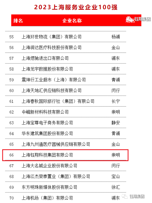 上海鈺翔科技集團有限公司2022年實現營業收入76.96億元,榮獲“2023上海民營企業100強第61名”、“2023上海服務業企業100強第66名”、“2023上海民營服務業企業100強第38名”三項榮譽。