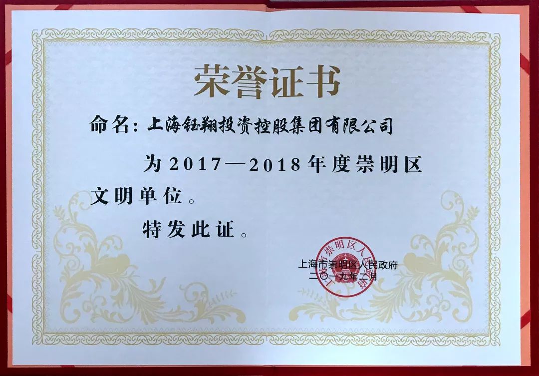 近日,鈺翔控股集團再次被評為上海市崇明區(qū)文明單位,截至目前,鈺翔控股集團已經(jīng)連續(xù)榮獲第十七屆(2013—2014年度)、第十八屆(2015—2016年度)上海市文明單位榮譽稱號,目前正在積極參評第十九屆(2017—2018年度)上海市文明單位。